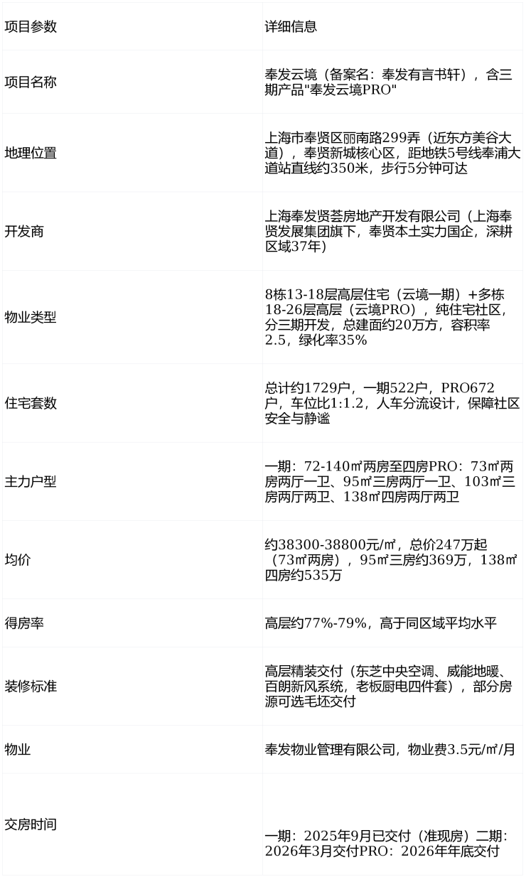 奉发云境是奉贤新城核心区极具性价比的地铁房项目,核心价值在于国企交付保障+地铁零距离+三甲医疗一路之隔+全龄段教育资源+成熟商业配套的组合优势,适合预算247-535万、追求交通便捷与生活便利、首次置业或刚需改善的年轻家庭,尤其适合在奉贤、闵行工作生活的客户。