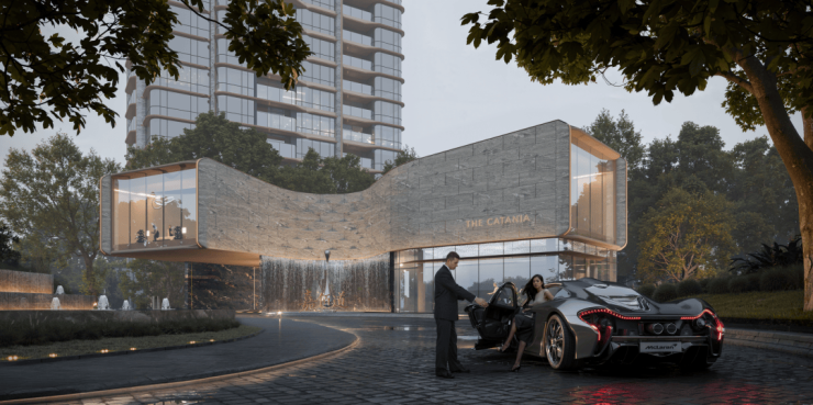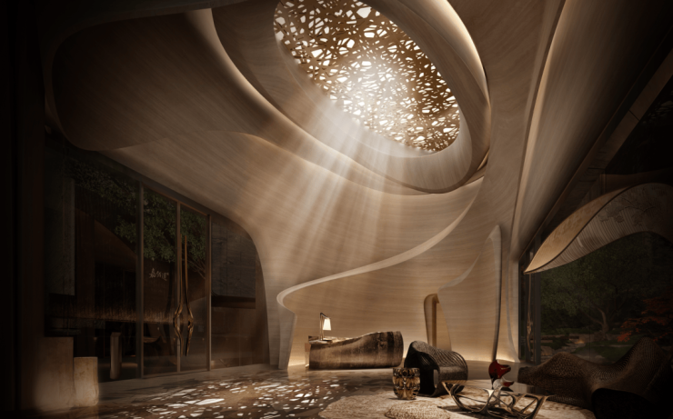 在建筑设计上,GOA大象设计跳出常规住宅的方盒子形态,以徐汇作为中国现代音乐发源地的文化基因为灵感,将“乐器王后”大提琴的优雅弧线,转译成建筑立面的二维曲线语言