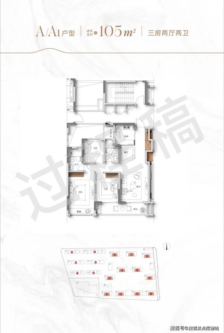 建面约105方三房两厅两卫户型: