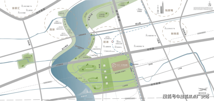 Located at the core area of Pudong New District's Sanlin Binjiang area (257/258 Zhongxiao Road), connecting to the Qiantan Central Activity Zone to the north, adjacent to the Outer Ring Ecological Corridor to the south, reaching Jiyang Road to the east, and facing the Huangpu River to the west, it is a key node in Shanghai's "One River, One Bay" strategic development. With a total construction area of approximately 180,000㎡, the project plans 15 residential buildings of 14-18 floors, with a plot ratio of 1.8-2.5 and green space ratio of 35%-65%, creating a low-density ecological community. As a strategic location on Pudong's "Golden Mid-Ring Development Belt," it is one of the last fully developed areas along the Huangpu River,承接 Qiantan Business District's industrial spillover and boasting an ecological layout of "one corridor, two hearts, three parks, and four zones."