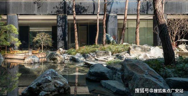 如果你坐在会所大堂的沙发往外眺望,地面上的架空中庭就隐在崖壁背后,活脱脱就是仇英笔下的《松亭试泉图》。这座下沉式庭院,是景观大师植弥加藤的作品,他在杭州的上一个作品,是绿城·凤起潮鸣。
