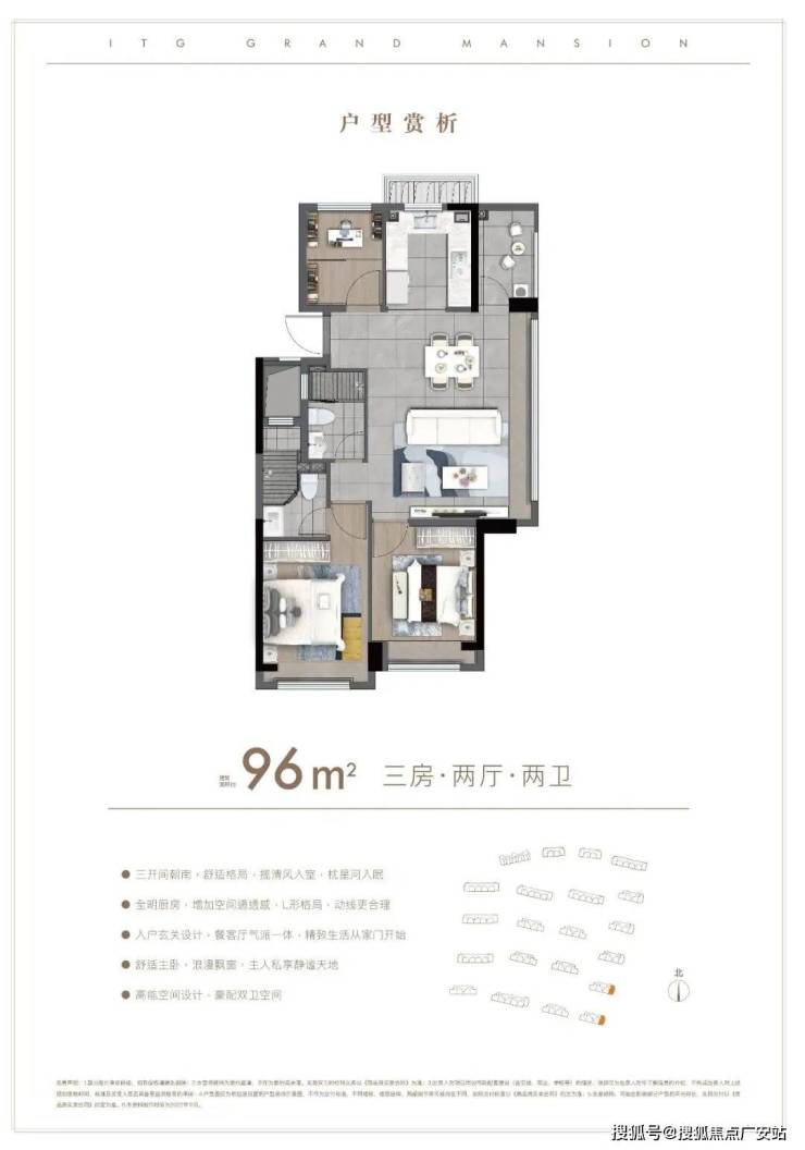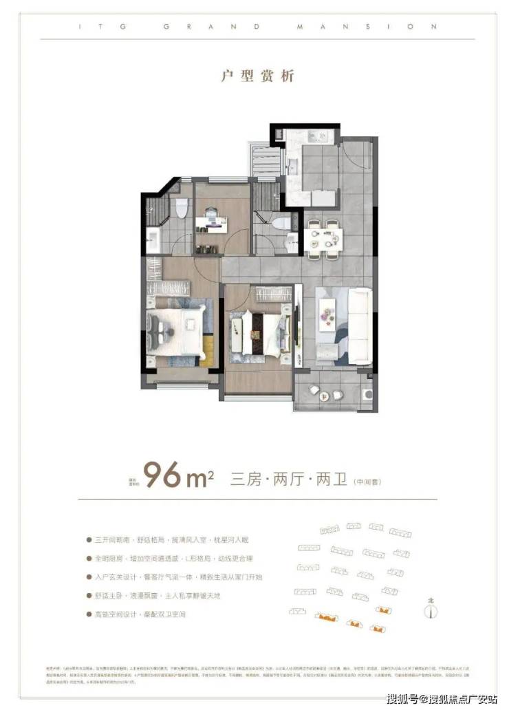 户型方面:约85-96㎡的全三房设计,南北通透,布局考究,动静分离。