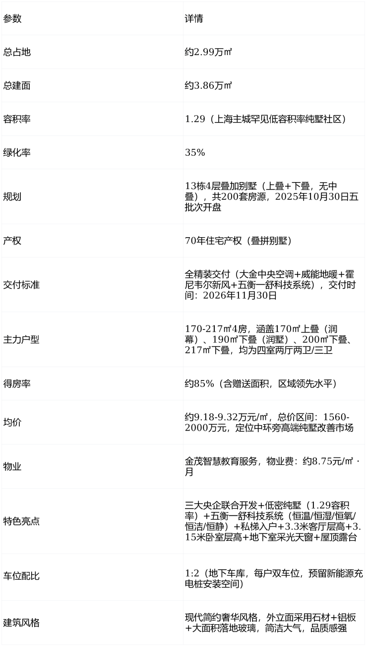低密纯墅社区,居住舒适度高:容积率仅1.29,上海主城罕见的"零中叠"纯墅社区,13栋4层叠墅,共200套房源,社区氛围纯粹,私密性强