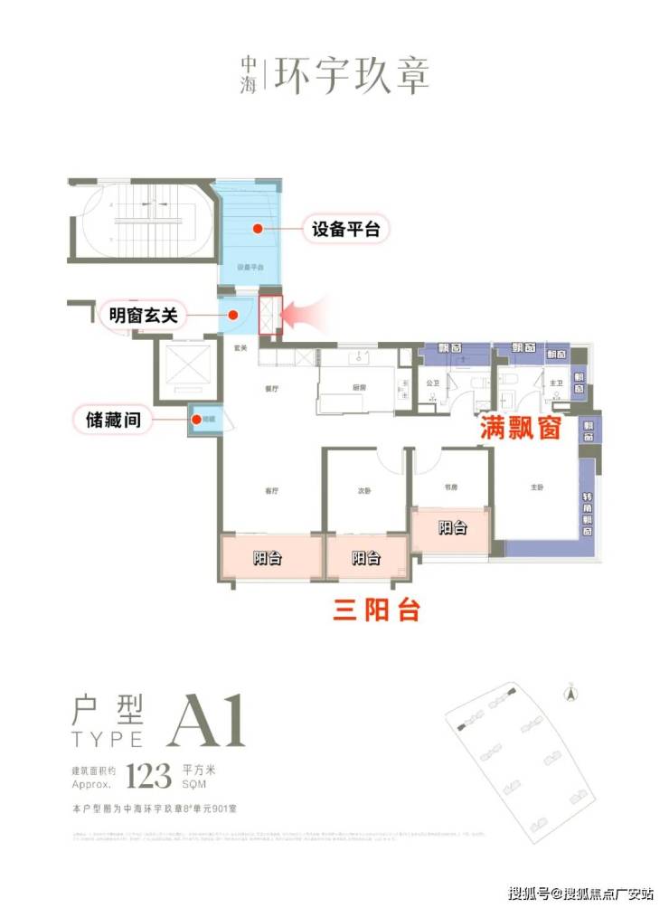 以建面约123㎡3房为例,区别市面上多数仅单或双阳台布局,该户型四面宽朝南+罕见的南向三阳台,实用性和采光度更强。