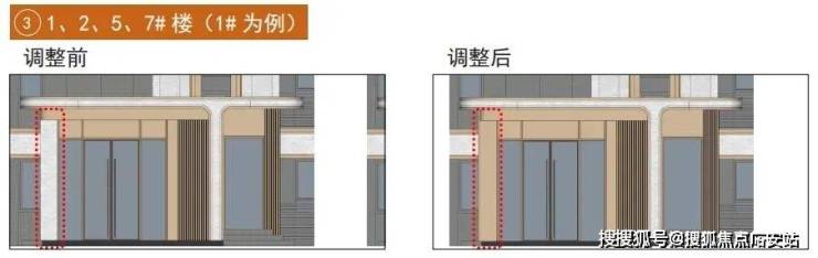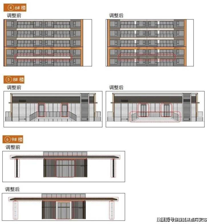 配套建筑同步升级:6#楼的 南立面调整了铝线条间的涂料颜色 ;8#配电站将台阶玻璃栏杆换为更耐久的 不锈钢栏杆 ,台阶及台阶下方浅色铝板改为 浅色仿石涂料 ,并调整外门开启角度至 180度 ,兼顾美观与实用;9#门卫兼快递收发室优化了屋面、柱子材质颜色,并根据现场深化了落地窗尺寸。