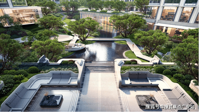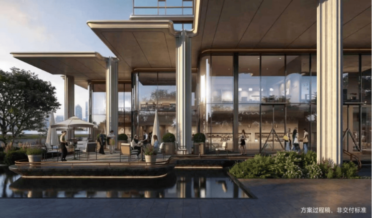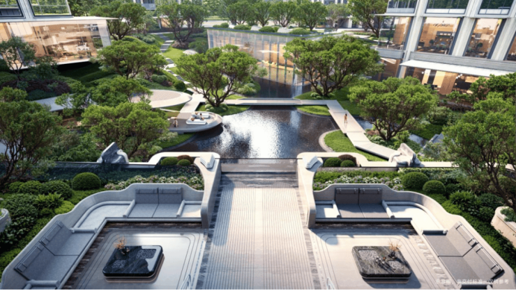 “回归之境”以3500㎡下沉水苑为核心,汇聚会客、泳池、茶室等多功能空间,形成仪式感十足的社区舞台。