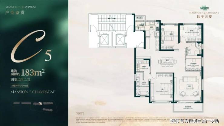 此户型最靠近苏州河,特地设计了270度转角阳台直面苏河一线景观!4个套房设计,尊崇感十足!