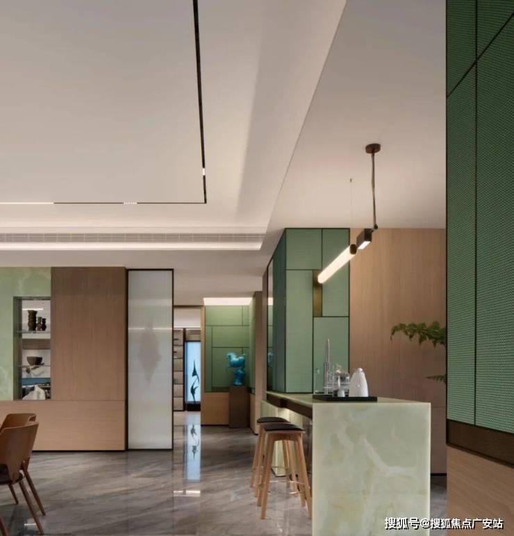 「梧枝绿」的皮革编织不仅用在餐厅背景墙,还用在了厨房的吧台边、主卧入口旁,它成为一种室内空间语言,连接起不同的功能空间,悄然带来了一种很有亲和力的仪式感。