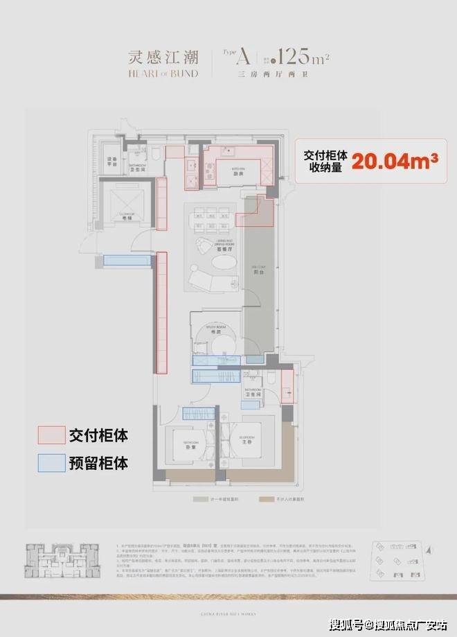 据小胖君手工统计,项目125㎡3房边套户型的整体交付柜子+预留衣柜,收纳空间可以达到约20.04m³,中间套户型也能达到约16.56m³!
