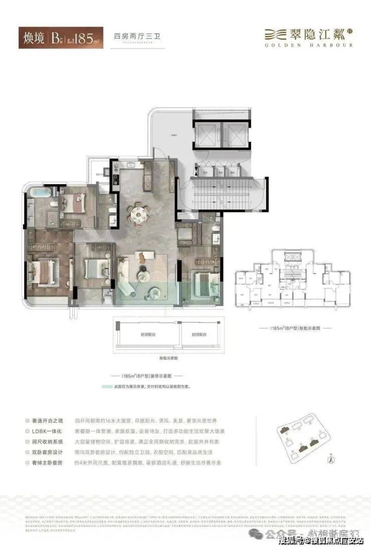 翠隐江粼轩的户型为建面约161-185-230㎡的纯粹大户型,起步就是四房两厅双套房的纯粹改善户型,是可以满足大多数家庭一步到位的终极改善之选。特别是在市中心豪宅起步面积动辄200㎡甚至更大的背景之下,翠隐江粼轩建面约161㎡的主力户型,甚至稀缺到成为市中心千万总价的唯一之选。