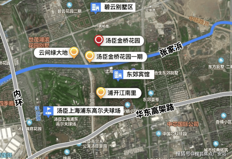 汤臣君品(汤臣金桥花园)位于浦东传统富人区东郊别墅区,西南侧与同属汤臣集团旗下、140万㎡的汤臣上海高尔夫球场隔水相望,东侧紧邻东郊宾馆,往北则是碧云国别墅区。