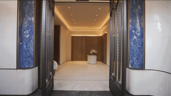 门庭延街的外立面,以精工定制弧形米色石材为主调,镶嵌典藏级老虎玉大理石,点缀古铜色现代海派艺术感灯器,整体呈现出百年海派的贵雅气质。