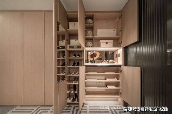 玄关收纳更精细,每个格子的规划都很贴近生活,随手物件、女主人的高靴、扫地机器人等都有各自安置空间。