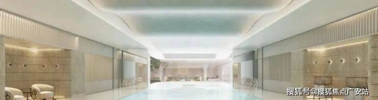 首创270度无界“悬浮”泳池,约400方的体量,3泳道,大量石材装饰,背后是极高的施工成本,通过大面的落地玻璃打通室内外的边界。