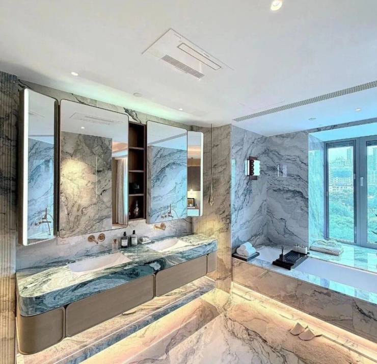 豪宅中,会所+泳池已经成为市场标配。但是万科中興傲舍,真正做到了 “把艺术作为生活的一部分” 。植物园泳池放在了2楼,选用了皮革面的绿色石材,营造一种树影斑驳的感觉。里面的绿植不是装饰,都是鲜活的、精心照养的。