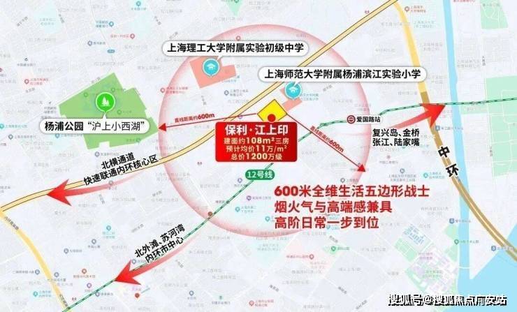 保利·江上印位于杨浦爱国路片区,地处周家嘴路与长阳路之间,东侧紧邻上师大附属杨浦滨江实验小学,距离12号线爱国路站直线仅约400米,