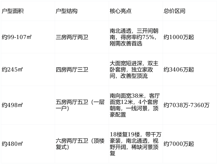 顶豪收藏:约480-498㎡大平层/复式,预算7000万起,适合高端资产配置,看重一线河景稀缺性与城市核心资源占有