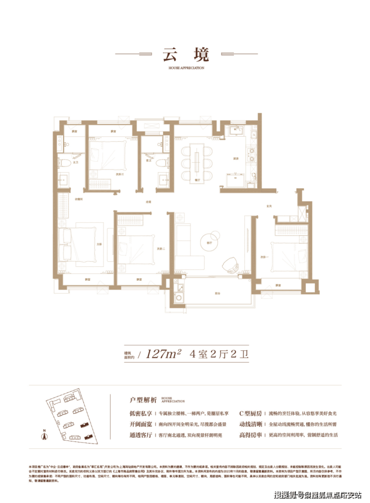 建筑约127㎡的「云境」空间内,四开间南向结合舒朗的方厅,大尺度的面宽让光赋予了生活更多的灵感。厨房U形台面,尽情挥洒味觉灵感,一体化的客餐厅创造更丰富的用餐、社交场景,从西式brunch到日式omakase,尽享味蕾的欢愉时光。 一梯两户的入户,搭配轩朗的玄关,让每一次归家,都更从容......
