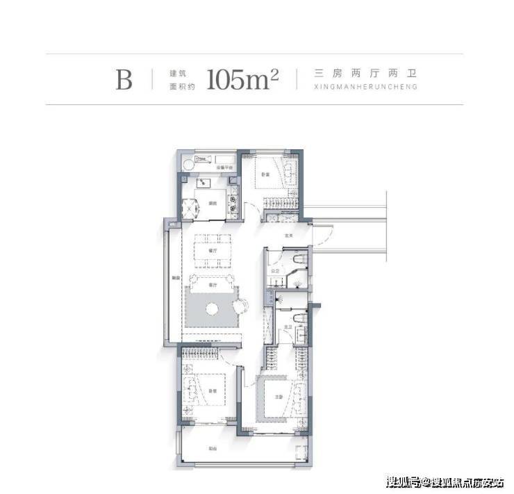 建面约105㎡带来了三房的舒适性升级,超大全景边厅+开放式厨房一体化设计,构建了大空间的动区生活核,更好地满足家庭聚会或朋友聚会对空间的要求。带步入式衣帽区的奢尺主卧套房,双开间宽景大阳台,品质感全面升级。