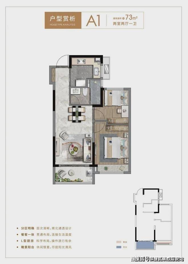 约73平两房户型,南北通透设计,南向瞰境阳台、主卧搭配飘窗,总价控制在200万不到,超低门槛,从容上车;