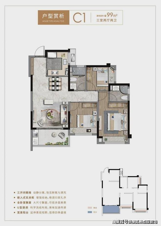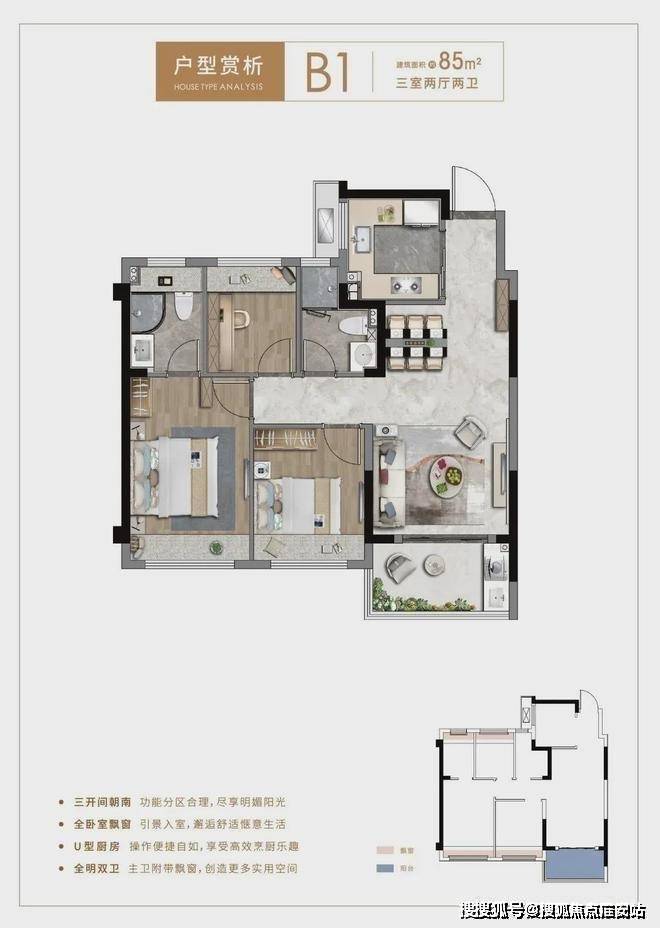 约85平三房户型,更是做到了三开间朝南,全卧室飘窗,拥有超大赠送面积,全明双卫,甚至主卫也附带飘窗,实用性拉满,而且该户型大部分房源总价在230万左右!