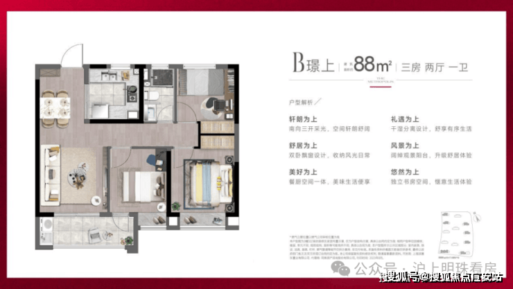 建筑面积约88m²户型是“明星”户型,一期首开即售罄。二期88m²户型房源占比60%,整个户型格局十分方正,通透感强,每个房间的尺度都恰到好处,非常适合刚需群体上车!
