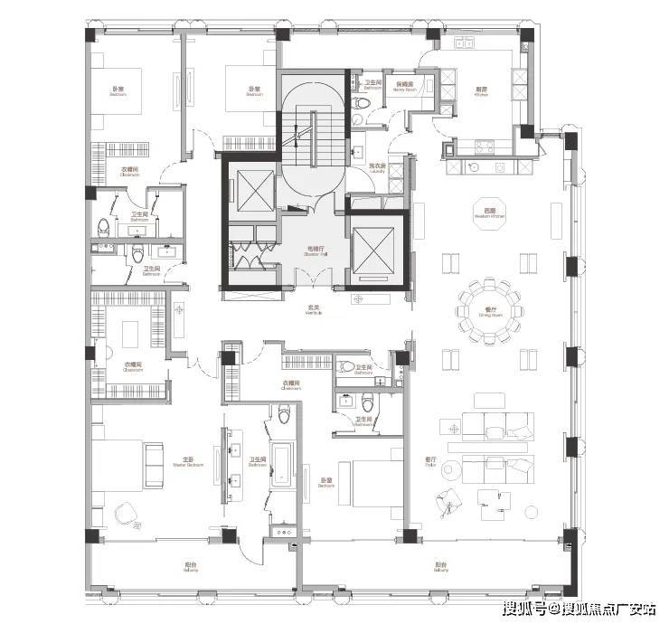 一期可售的户型面积集中在458-641㎡。当风貌平层户型尺度做到这个层面,其实户型本身已经无可挑剔了。仅说个细节,一期风貌平层中,做了罕见的做了两梯一户配置,主佣分离很好地保证了业主的隐私性和动线。