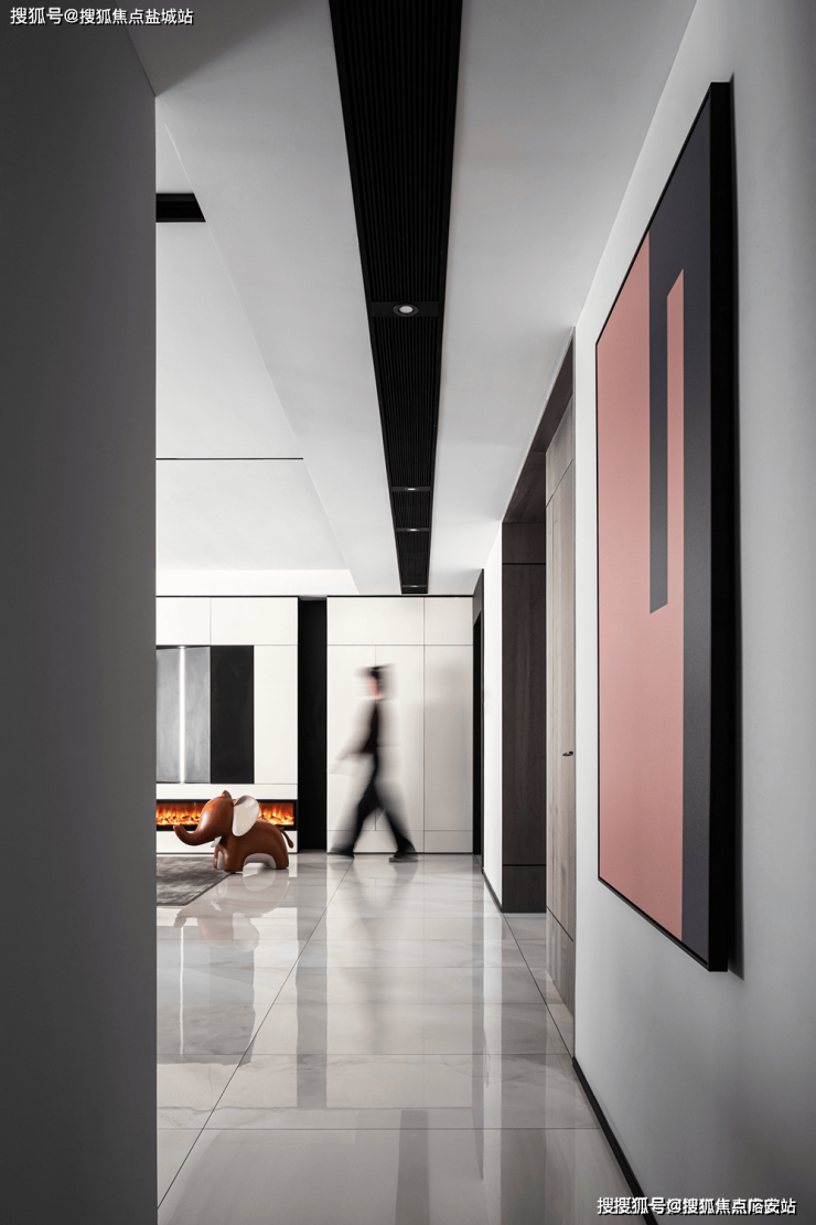 餐厅视角尽头是中厨,利用了隐藏式推拉门设计阻挡了油烟,内部整体色调依然以黑白为主。过道墙壁精心设计为收纳空间,最大限度地利用了每一块空间增强收纳功能。