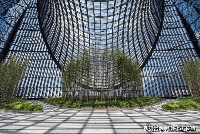 外立面以“H”形为核心意象,呼应杭州拼音首字母,打造八大幕墙类型适配多元业态。冷弯玻璃如江面流动,彩釉垂幕渐变透光,60米跨度钢结构天桥连缀双塔,底部参照江南拱桥设计,刚柔并济的造型与钱塘江景相映成趣。