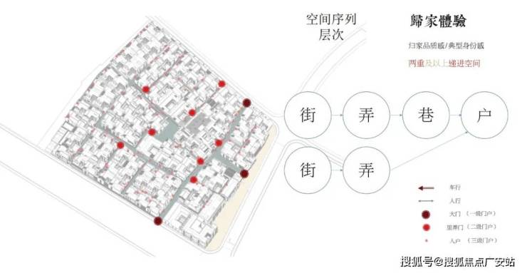 社区规划可分为蓬莱路城市公共景观以及社区内部景观两个部分,其中市政绿地衔接于上海2035城市总体规划中“蓝绿丝带”的上位条件要求,社区内部街巷空间形成空间序列形成递进的层次,将归家体验的序列依次展开,形成城市街道→入口(一级门户)→街巷→节点空间→里弄门(二级门户)→合院入户(三级门户)的方式,基本可保证大多数住户可体验到两重以上的空间递进。