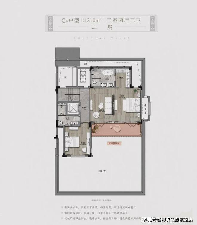 在建筑空间设计上,富春御园实现了传统院墅的现代革新。项目采用两层地面+地下室的创新布局,以170-320㎡的灵动尺度,打造出户户带庭院的中式合院。建面约320㎡的隐世合院以江南古镇为原型,约一亩地的家庭院落内亭轩错落、假山流水,目之所及尺度奢阔;而210㎡舒居合院则以约12m的南向开间,升级了人居体验感。这种既保留东方隐逸情怀,又融入西方享乐主义的设计哲学,使富春御园成为当代名仕的"第一居所"