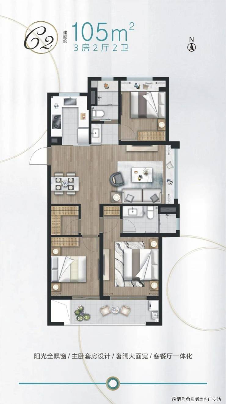 建面约105㎡3房,餐客大横厅设计,与南面阔景阳台相连,采光通风良好。全卧飘窗,主卧套房设计,提升了居住舒适度。U型厨房,动线流畅。