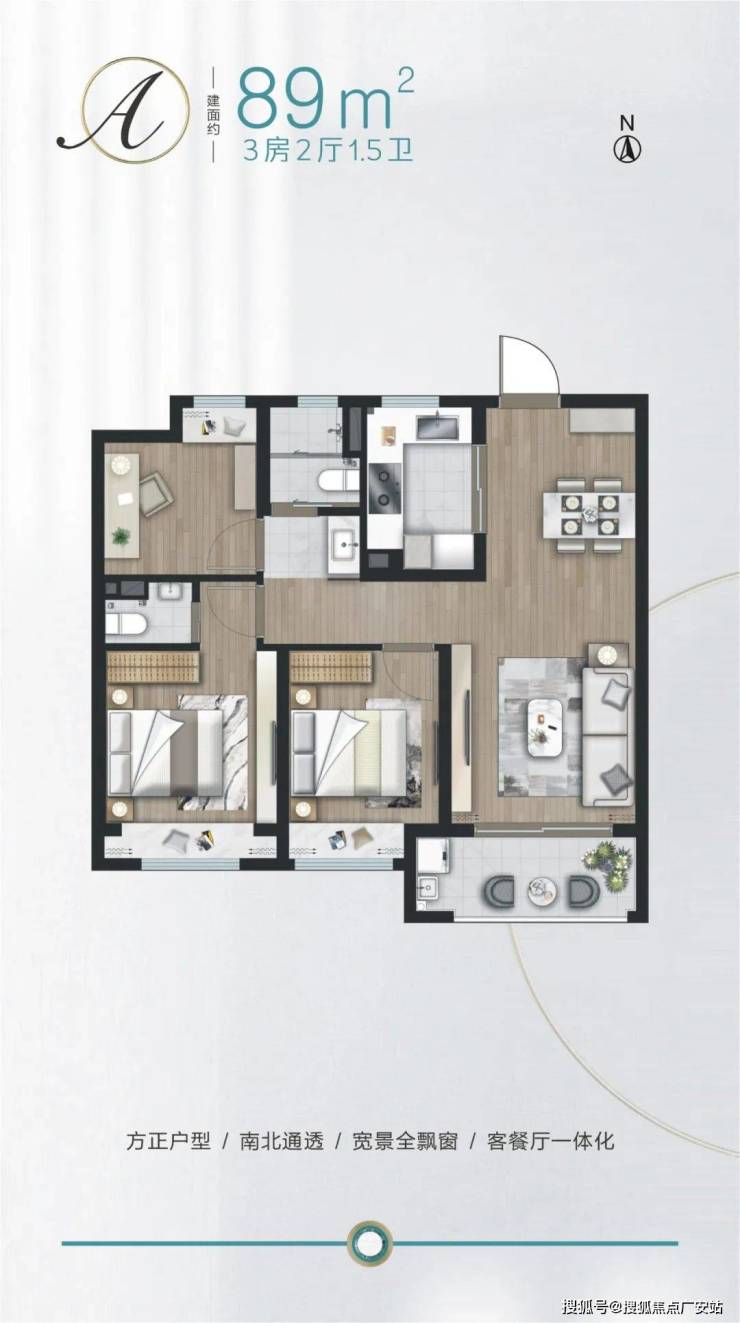 建面约89㎡3房,户型方正,三开间朝南。餐客厅一体,连通阳台,采光通风俱佳。全卧飘窗,主卧套房设计,提升了舒适度。1.5卫设计更加人性化,便于使用。