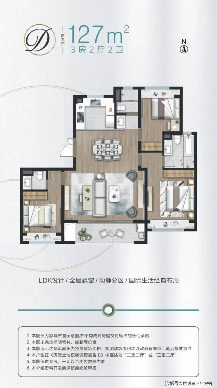 建面约127㎡3房,飞机户型,动静分区。双套房设计,私密性舒适性俱佳。客厅预留灵动空间,可作为书房、儿童活动区使用。