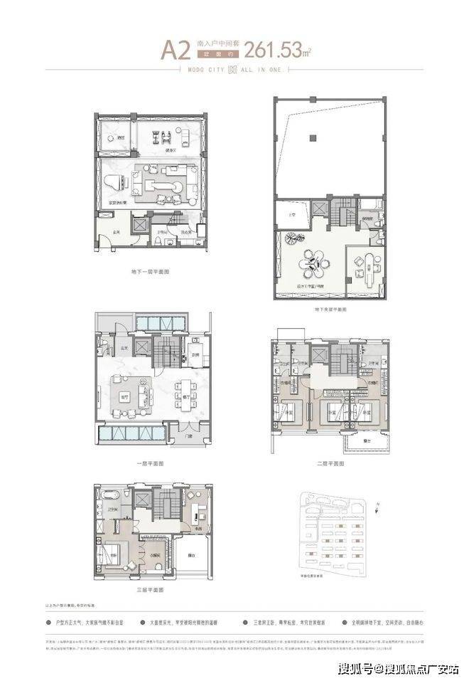 户型:建面约262-305㎡,地上三层+地下两层,层高3.6米起,地下室层高5.4米。