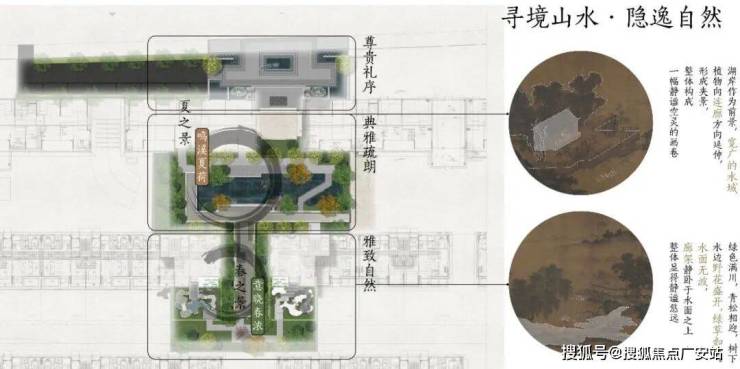 园林设计灵感来源于临平山上塘河,引山水入园,演绎宋式精工居所,整体遵循宋代江南水乡的古城肌理,展现大宅的隐奢调性,营造出“居山水、观天地”的空间意境。三进二庭五园的山水轴布局,两轴九景四时的极致意境生活。