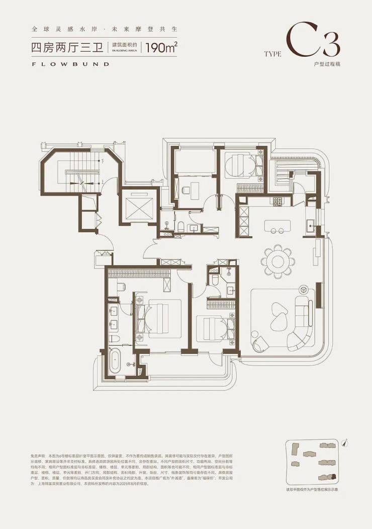 改善家庭的理想之选约190㎡四居,东边套主打270° 全景视野,客餐厅采用弧形玻璃幕墙环绕,东侧可远眺黄浦江景,北侧可俯瞰社区下沉式庭院,景观视野堪称极致;