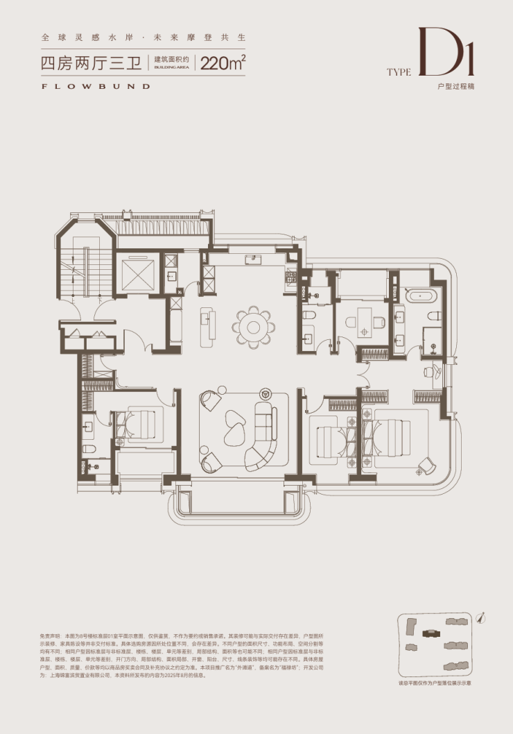 位于5号楼楼王位置的约220㎡四居是顶豪家庭的终极之选。270°景观舱式设计,结合超大面宽阳台,形成了连续四个开间的奢华南向景观面。