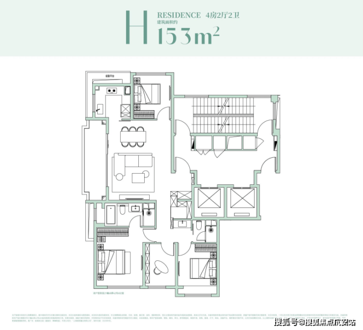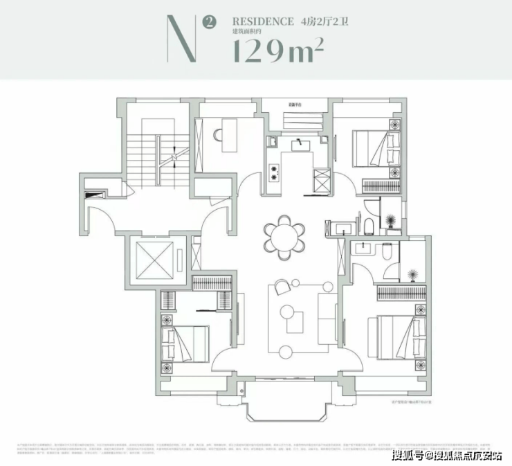 该户型是经典的四叶草布局,四开间分布在四角,兼顾私密与互动,是二胎家庭的优选;