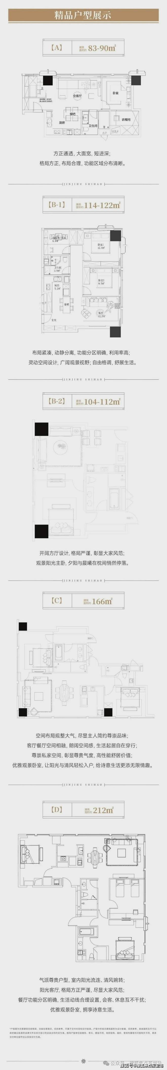 户型:173套房源,主力面积84-420㎡(4梯8户),层高3米,精装交付(现房)。