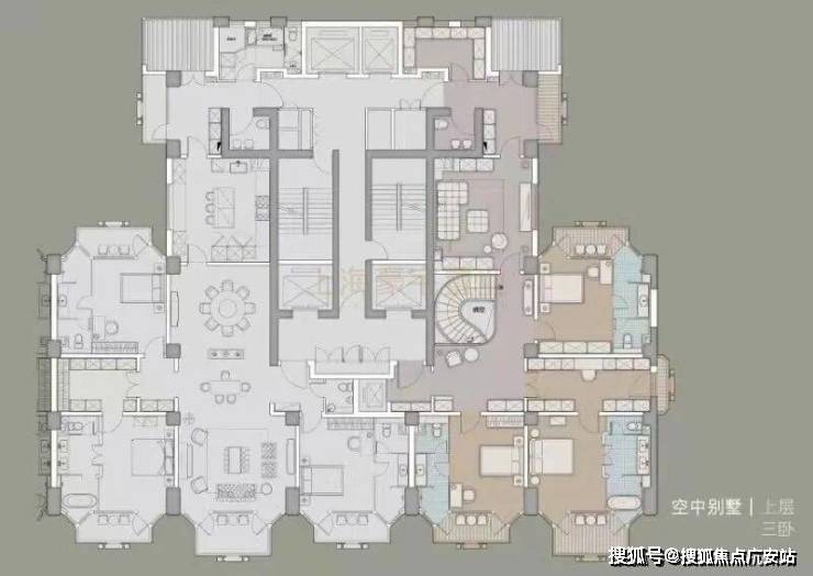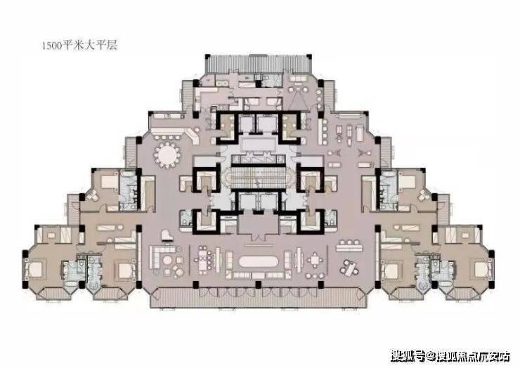 主力面积为370、750、1500㎡三个面积段,即半层、一层、半层复式、整层复式几种,南侧一栋住宅户型呈金字塔造型,四间套房,超大客餐厅,充分利用南向面宽,360°采光不浪费一丝一毫江景。