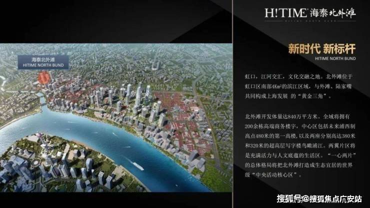 根据上海规划资源局新规划,北外滩将按照“高标准、高水平”的总体要求,以“世界级会客厅”和“具有全球影响力的世界级滨水区”为目标,与外滩、陆家嘴共同打造“黄金三角”核芯商务区的战略高地,并提出“三年出形象、五年出功能、十年基本建成”。