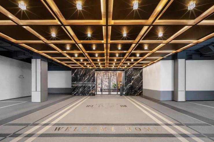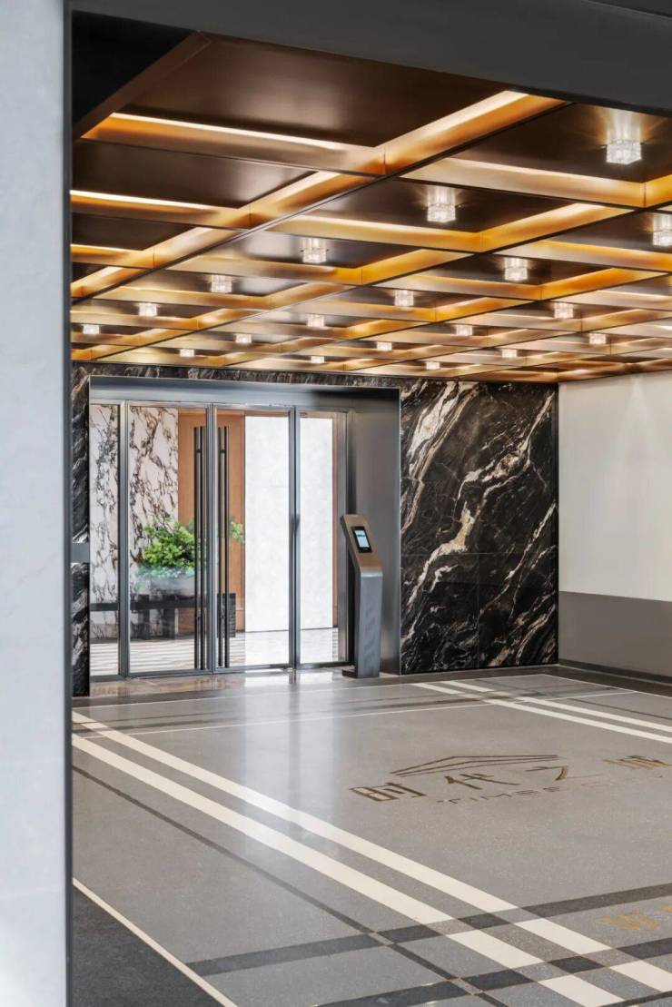 在选材方面,部分采用冰火板与岩板组合打造车行道廊柱,结合仿透光云石工艺定制的车牌标识,部分主要通道更以全铝板铺设吊顶,从细节处彰显高端社区的品质感。