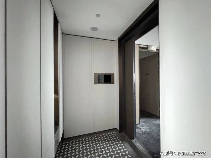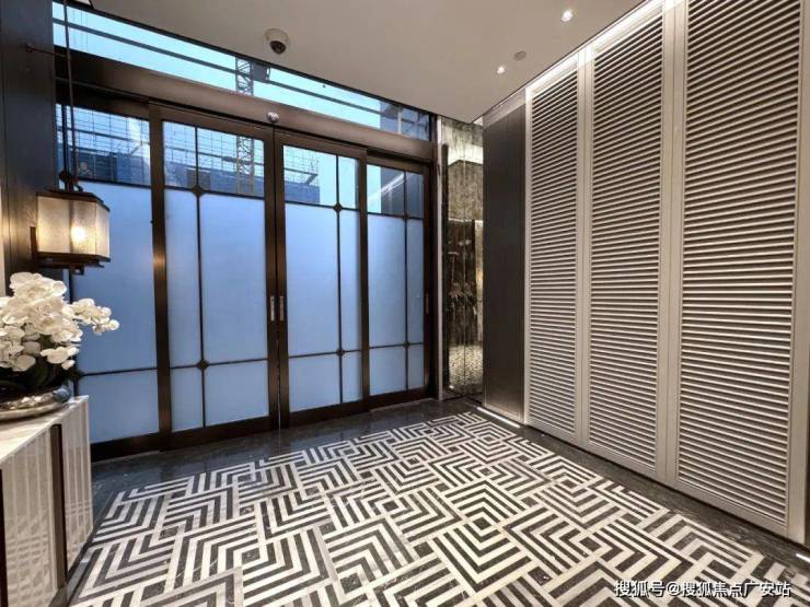 以142㎡大户型为例,独立玄关,地面是海派拼花,通顶玄关柜,内置鞋柜精灵,可伸缩衣架等。玄关柜雕塑背后也是一整块的透光奢石,划重点:交付有!