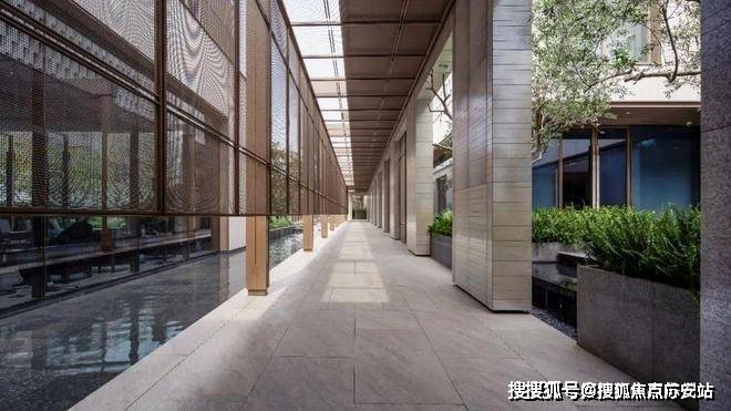 漫步于水榭光廊,阳光透过格栅在地上形成斑驳的光影,与单侧的水景波动的涟漪互动,让人在潜移默化中,获得身心的舒缓。
