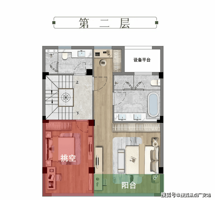 三层,整层套房设计。约27㎡的南北双向空中别院,可以演绎更多的生活可能,一把躺椅,几杯清茶,感受晚霞余晖、感受微风吹拂,诗情画意的生活在此具象化。