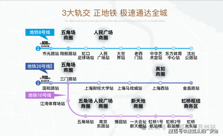 交通立体,三横二纵三轨交立体交通网。直线距离约800米就是8号线市光路站、还有20号线(规划)国和路站和10号线三门路站,串联起五角场、虹口足球场、静安、人民广场、新天地、淮海路等核心商圈。
