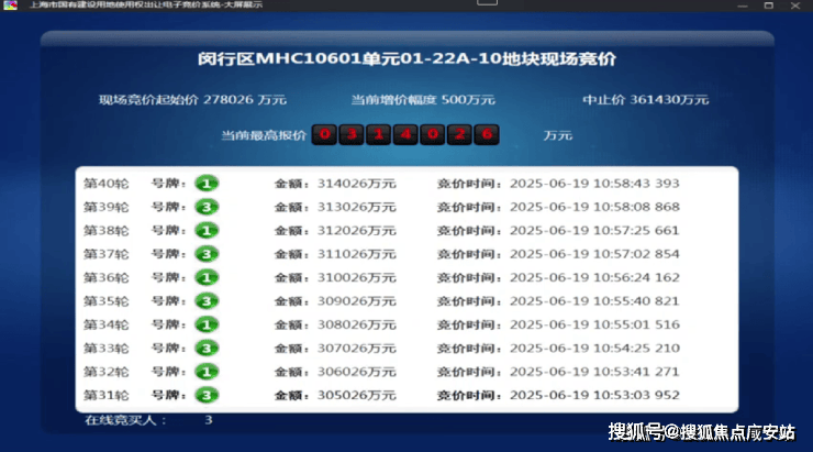 6月19日,闵行1幅地块出让,地块名称为颛桥镇MHC10601单元01-22A-10地块,规划用地性质为住宅用地,出让面积4.05公顷,容积率为2。经过40轮竞拍,最终由上海保利城市发展有限公司竞得,总成交价314026万元,溢价率12.95%。