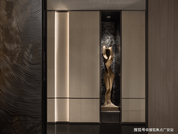 玄关作为家宅之始,便以温暖材质与柔和灯光相迎。通顶柜体的设计,暗藏存储空间,让出行与归来皆倍享自在。辅以嵌入的雕塑艺术,既是端景,又可机动变换为节日活动主题元素,在方寸之地赋予入户无限可能。