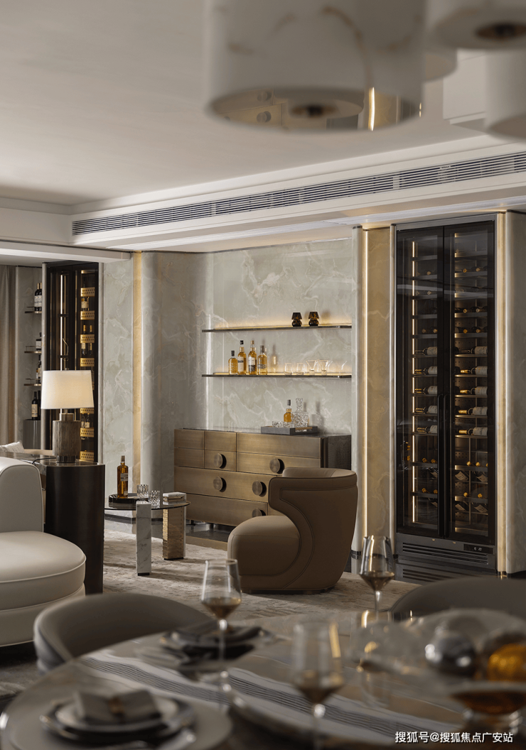 弧形沙发后的一组休闲椅,旨在实现生活方式及场景需求的变换组合。既是茶台,亦可是开放的亲子空间。同时有效利用墙体和飘窗,定制丰富的藏酒区,以美学介入未来生活,透露居者品味之余,让这一隅也拥有着无限延展性。